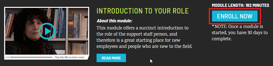 Once you find a module you want to enroll in, click the "Enroll Now" button at the right hand side.