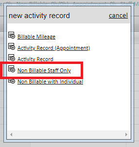 | A menu will appear, asking what kind of record you want to create. Choose “Non-Billable Staff Only.” | |